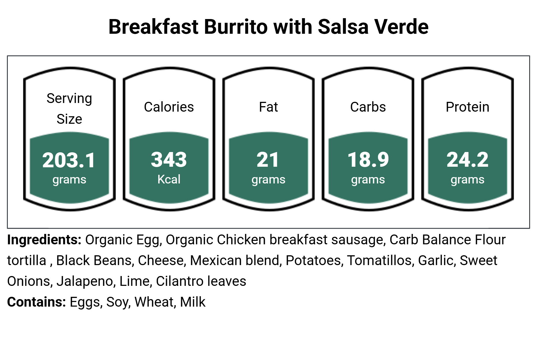 Organic Egg, Organic Chicken breakfast sausage, Carb Balance Flour tortilla , Black Beans, Cheese, Mexican blend, Potatoes, Tomatillos, Garlic, Sweet Onions, Jalapeno, Lime, Cilantro leaves